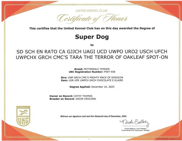 Tara and I attended the Gateway Nationals in Missouri October 28,29 & 30 2011 and Tara received her Agility 1 title and CD Obedience making her the first Patterdale to achieve the Superdog title.