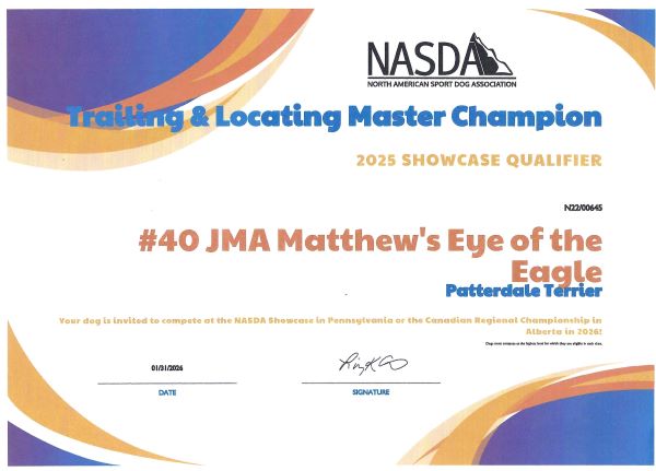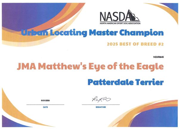 Super proud of Talon earning her Master Championship for NASDA Urban Locating! Thank you Common Scents Dog Sports for beautiful ribbon!!