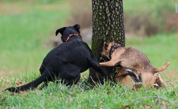 Some fun pictures of Talon running Brace (2 dogs run together) to find the rat in a big field where there are blank boxes with bedding......she had fun with the Lab pup until she found the rat!!