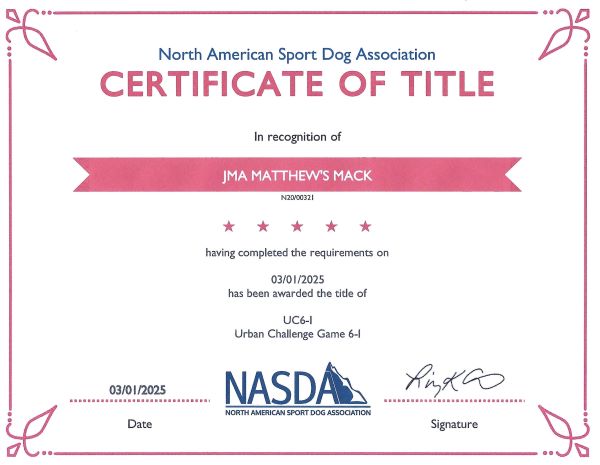 Jayla has been trialing Mack in the NASDA Urban Games since we have to run the trials blind (can only run one dog so you don't know search) and Tara will only work for me! Jayla has done a excellent job with Mack and he has completed six of the six games and earned his Urban Challenge Level 1 and Versatile Locating Gold!!
